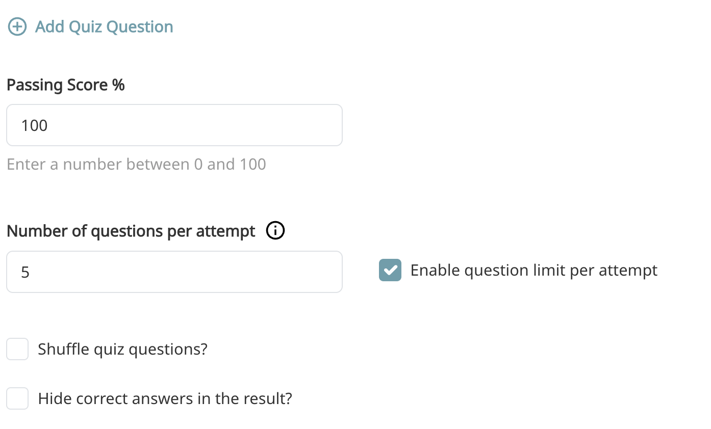 To add a new question, click the Add Quiz Question button. The Passing Score represents the required total score for a user to pass a quiz, the default is 80%. If you want each user to see the questions presented in a random order, click the Shuffle Quiz Questions option. If you choose Hide correct answers in results, the student will see their score but not the correct answers.